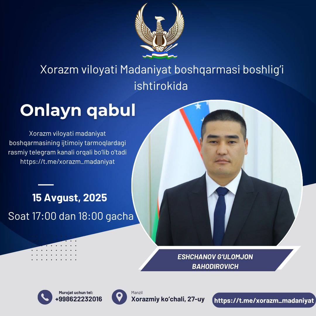 Buning uchun Siz joriy yilning 15 avgust kuni soat 17:00 da Xorazm viloyati madaniyat boshqarmasi boshlig‘ining navbatdagi onlayn qabulida ishtirok eting.